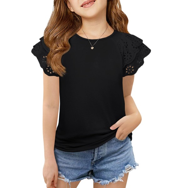 Haloumoning Girls Ruffle Sleeve T Shirts Summer Short Sleeve Casual Cute Crewneck Tops Tees 5-14 Years Black