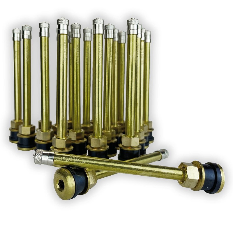 - Twenty Five Haltec TR573A straight 4 3/8" inch long brass clamp-in tubeless valve stems with EPDM grommets and high temp valve cores.