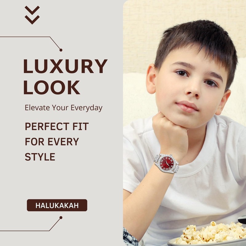 Halukakah Diamonds Watch Iced Out for Boy Teens - Platinum Plated - 36mm Red Dial - 8" Length Adjustable Wristband - Comes with Cuban Chain 16", with Watch Adjuster Tool - Goldfoil Giftbox
