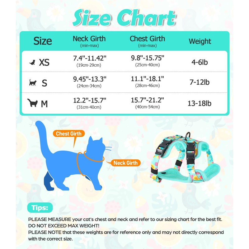 - SIZE INFO - Available in XS, S, and M, it's tailored for necks from 7.4 to 15.7 inches and chests from 9.8 to 21.2 inches. Before purchasing, please measure your cat's neck and the chest under the armpits of the front legs. (*NOTE: New to harnesses? Your cat may need a week to adapt.)
