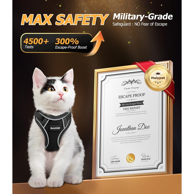 • [NOOOOOO.1 Escape Proof Cat Harness] At Halypet, we share your enthusiasm for felines and prioritize their safety. After dedicating 4 years and conducting 50,000 rigorous tests, we are pleased to introduce the “H600 Pro” escape-proof cat harness like never before. Our harness features a dual protection design, 3 quick-release buckles, and 3 sliding straps, allowing for easy adjustment and a snug fit around your cat's body. Your feline companion can enjoy the great outdoors without concerns.