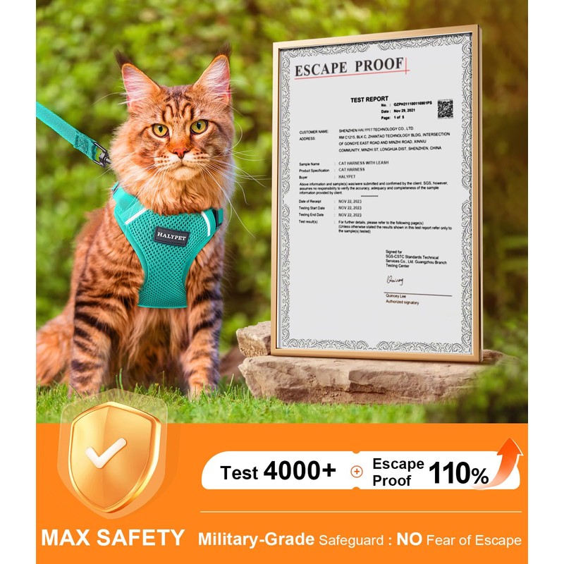 - 👍[Revolutionary Escape Proof Design]To ensure that every cat has the right to bathe in sunshine freely and securely, Halypet team, has paid over 600 days efforts to test “Escape Proof” more than 4000 times, and finally creates this new cat harness and leash set, “H200 Pro” after 3 updates, based on feedback from hundreds of cat lovers. Patent in Pending. Our revolutionary Escape Proof Design allows your cat to always travel outdoor with you safely.