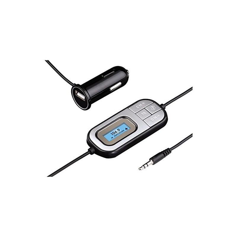 Hama Auto-Scan FM Transmitters – FM Transmitter 88.1 – 107.9MHz with Black Wire, Silver (88.1 – 107.9 MHz, Wired, 5 V, 1 A)