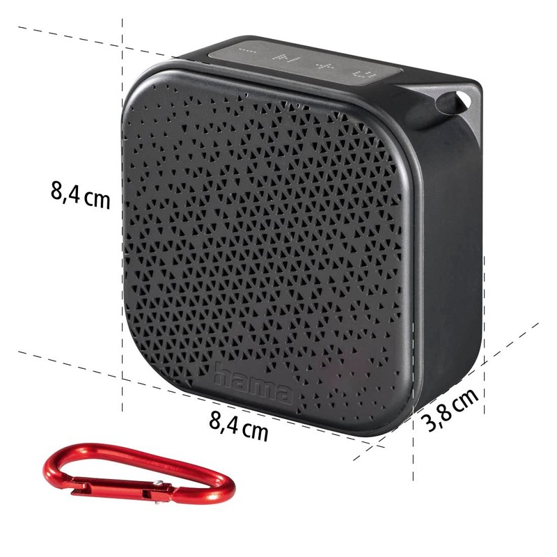• Durchdachte Mini-Box für Handy, Tablet etc.: Music Box mit praktischem Karabinerhaken zur Befestigung am Rucksack oder Sporttasche, LED-Anzeige des Akkus (Ladezeit 3h per USB-C), Freisprecheinrichtung