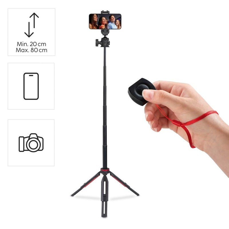 - Table tripod and selfie stick: flexible extendable from 22 to 80 cm, 4-stage extendable tripod legs, ideal for photo and video shooting at different heights, compact travel size