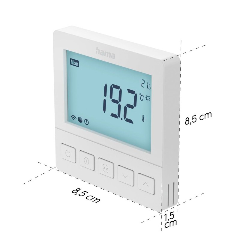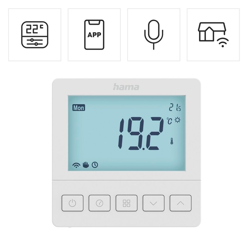 • Smart home thermostat: control via app via Hama Smart Home app anytime and anywhere, via voice command at home or manually directly on the display, expand with other smart products e.g. window contact