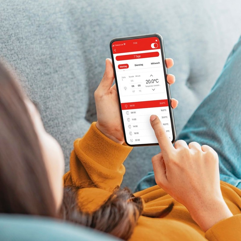 • Smart heating control: automatic programs for individual heating control, e.g. schedule for each day of the week, adjustable from 5 - 35 °C (display in 0.1 °C)