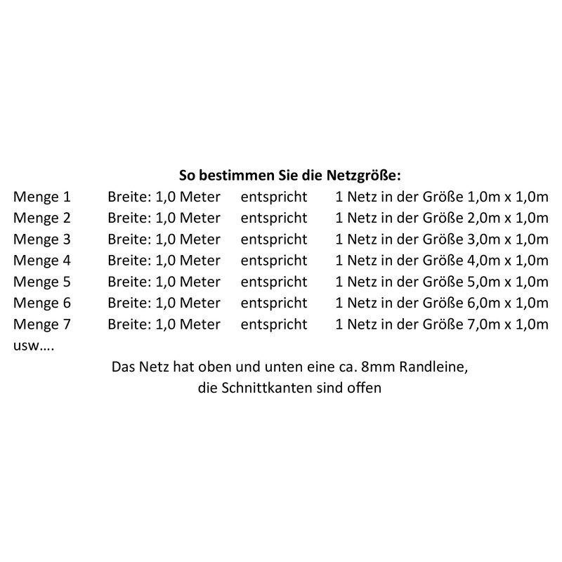 - Use the quantity to determine the length of the net, e.g. with quantity: 5 - you will receive a net with the dimensions 1 m x 5 m.