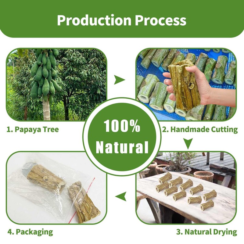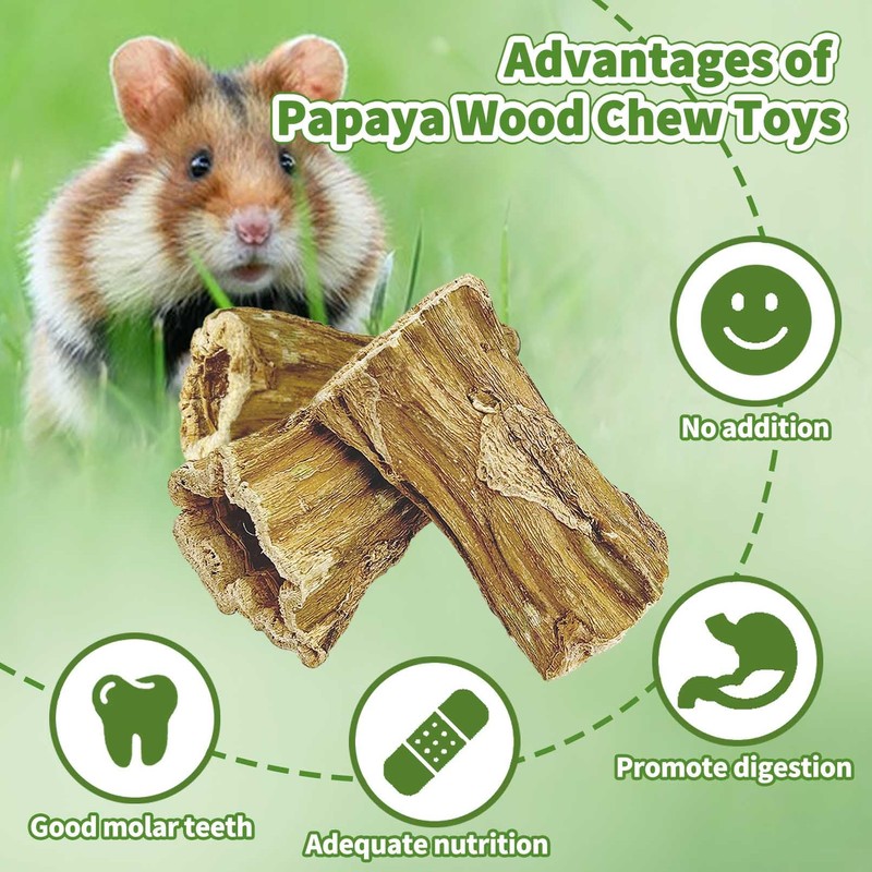 - Organic Papaya Wood Material: Our rabbit chew toys for teeth is made from fresh papaya tree trunks, no other ingredients are added and exudes a natural plum aroma. Each chew toy is fitted with a metal retainer that can be attached to any cage.You can use this rabbit toy with confidence to bring them a health and safe enjoyment