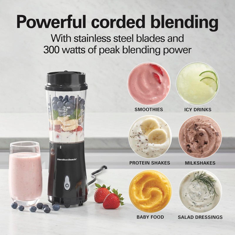 Hamilton Beach Portable Blender for Shakes and Smoothies, 14 Oz BPA Free Travel Cup & Lid, Durable Stainless Steel Blades, Personal Smoothie Blender, Black (51101AG)