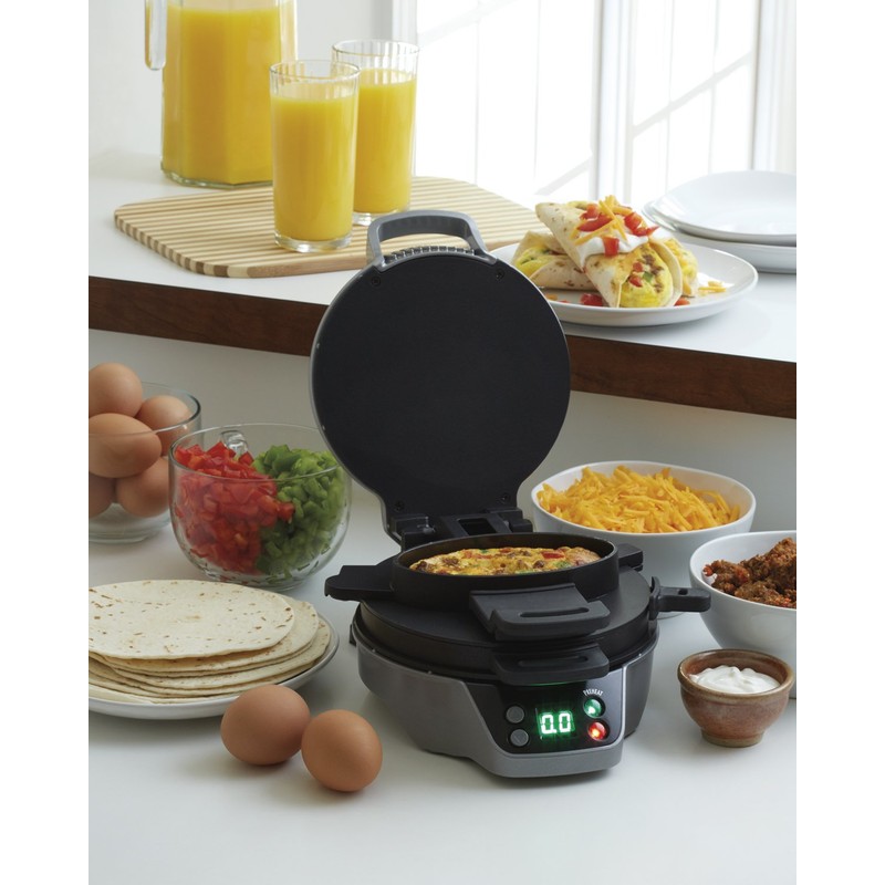 Have a piping hot breakfast burrito ready in five minutes with the Hamilton Beach Breakfast Burrito Maker. This convenient appliance is easy to use and it does all the cooking for you. So why skip breakfast or run to the drive-thru? We've made cooking simple. Now, the hardest part for you will be deciding which ingredients to use. The preheat light will tell you when it is ready, then it's time for you to get creative. Just layer all your favorite ingredients; burrito, egg, cheese, peppers, precooked ham and more into the Hamilton Beach Breakfast Burrito Maker and let the magic happen. There's no need to stand and wait, the built in timer will sound an audible tone to let you know when cooking is complete. Your burrito is easy to remove. Hot, fresh, and ready to enjoy within minutes. The Hamilton Beach Breakfast Burrito Maker was designed to cook burritos, but it can do so much more. Stuffed pancakes, omelets, crepes, even personal pizzas are possible. To make cleanup easy, the cooking surfaces are nonstick and all removable parts are top rack dishwasher safe.