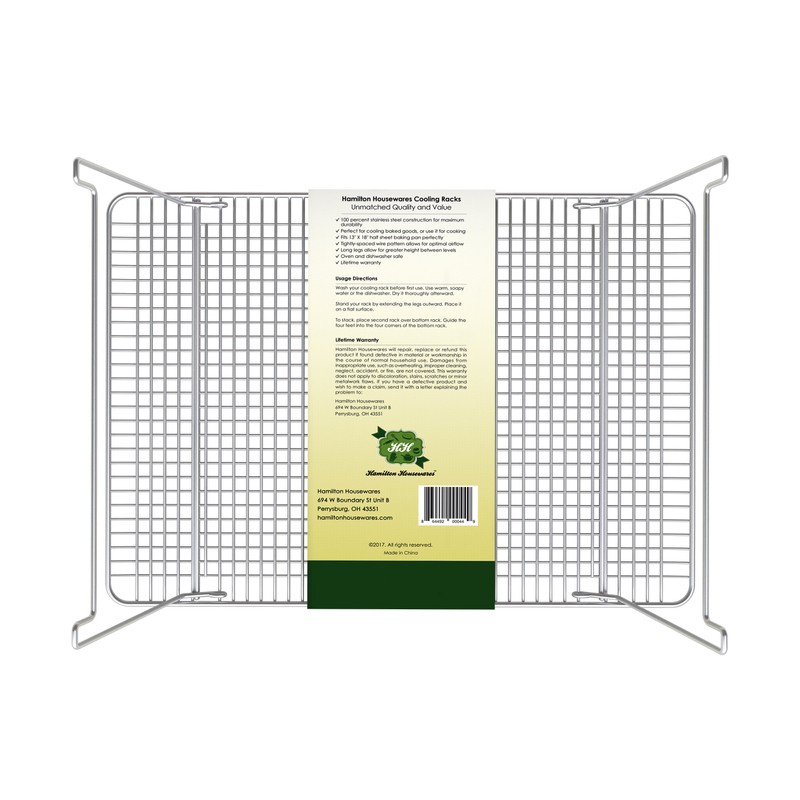 If you’re looking for a stackable cooling rack, you might be frustrated by their limitations. Some aren’t oven safe. Others don’t fit into standard baking pans. And many have large spaces between their wires, letting food fall through. The Hamilton Housewares 12” x 17” Stackable Stainless Steel Cooling rack is the answer. We designed it with these drawbacks in mind and delivered an exceptional solution. It is oven safe to 575 degrees, fits half sheet baking pans when folded, and has a wire grid tight enough for small foods like French fries. Furthermore, we’ve increased the standing height to accommodate your largest baked goods. Like our other racks, we use nothing but Grade 304 stainless steel for maximum durability and rust resistance. Your search is over.