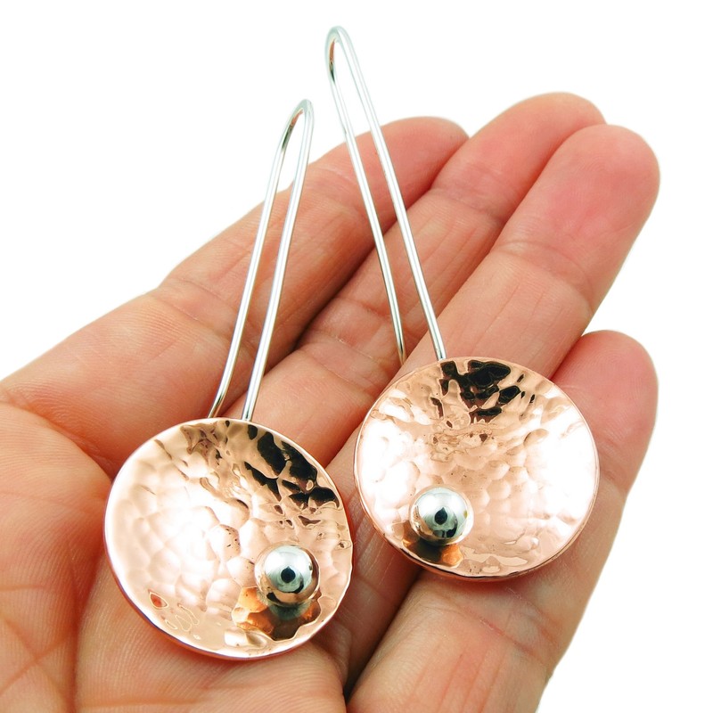 Hammered Copper and 925 Silver Threader Circle Drop Earrings Handmade Jewellery