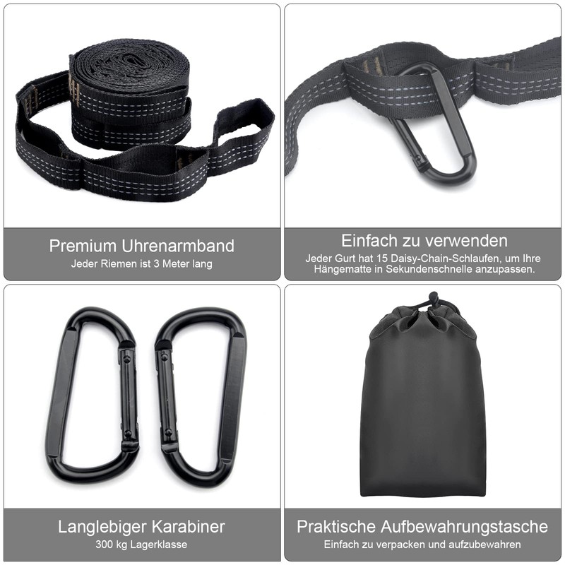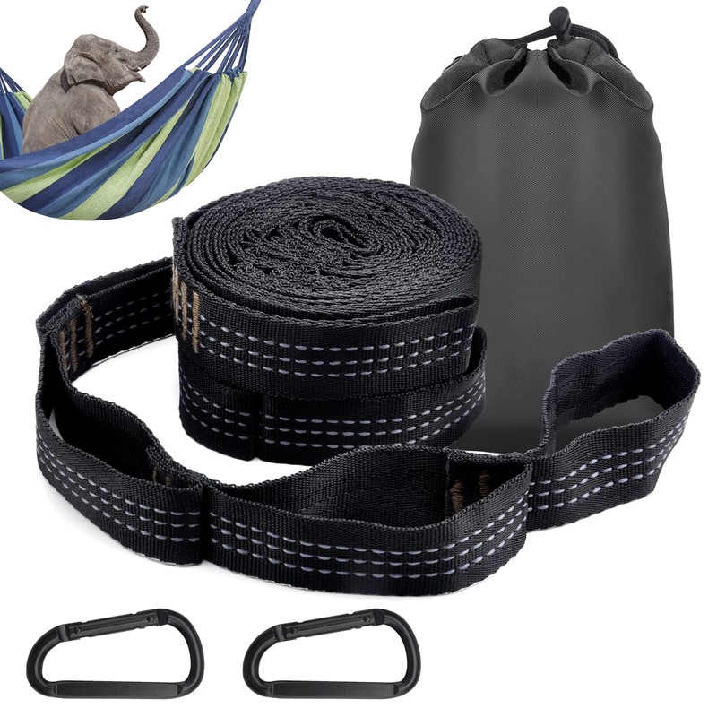 - Easy to use: attach your hammock quickly and easily by placing one end of the strap around a tree and hooking your hammock into one of the 18 pre-made loops with the help of a carabiner. The included bag allows space-saving and safe transport of the straps.