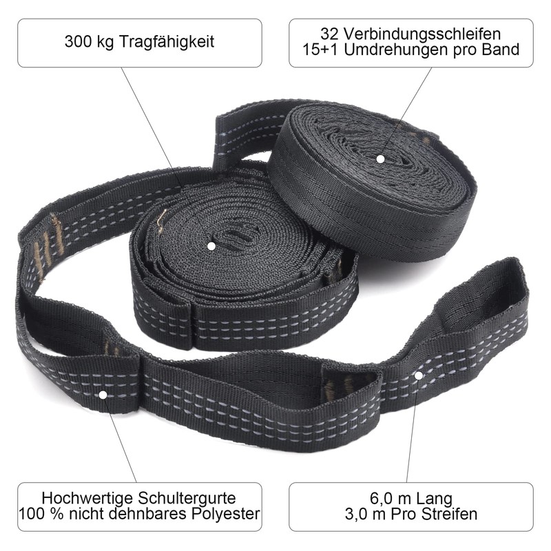 - Adjustable and flexible: Each of the two attachment straps is 300 cm long and 2.5 cm wide. It has 18 loops that allow the length to be easily adjusted to different distances.