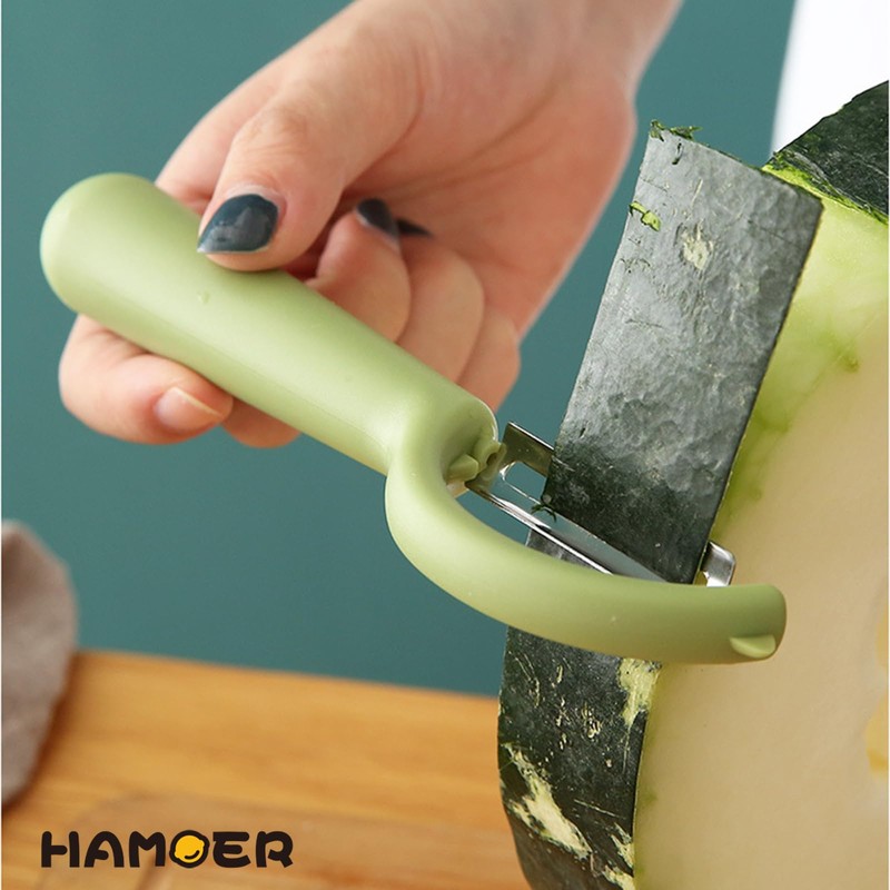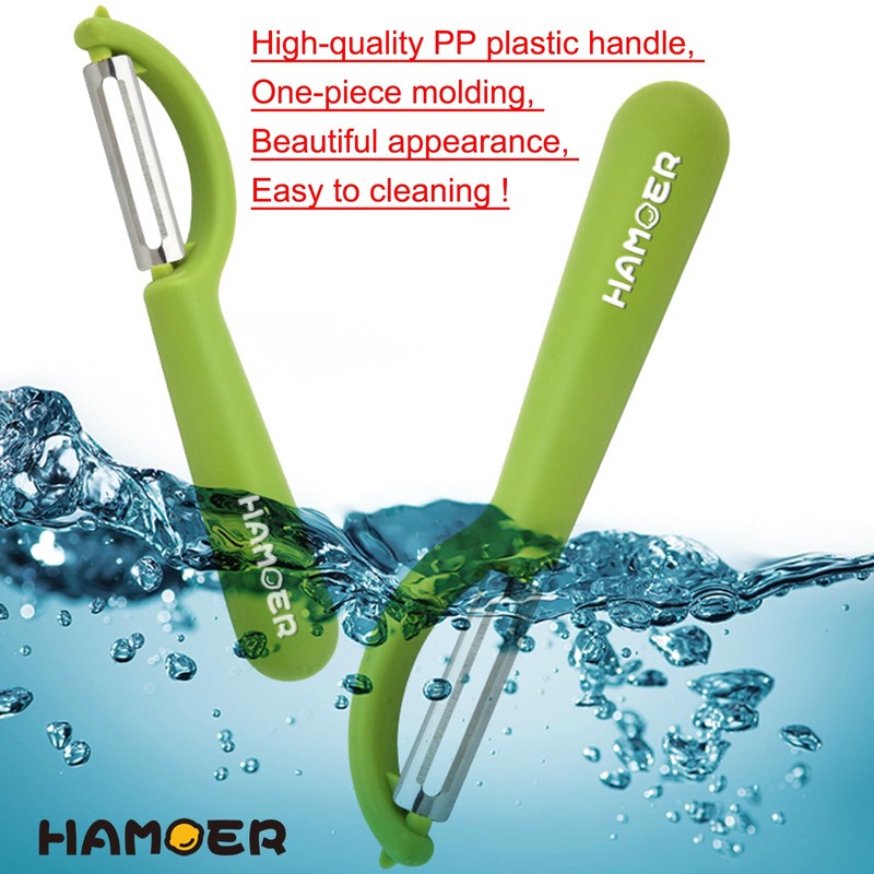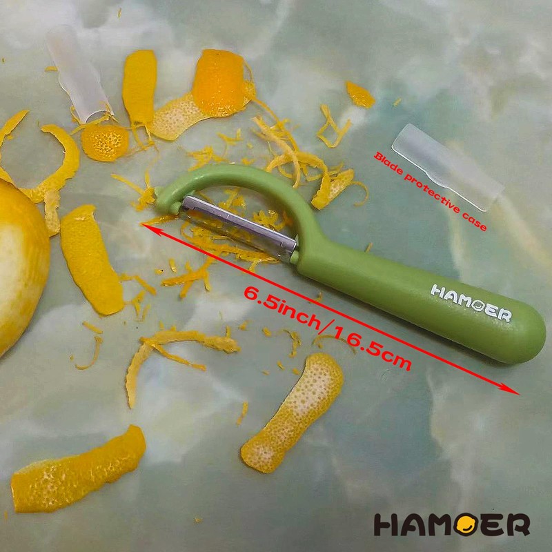 - The Hamoer P peeler comes with a protective plastic blade cover. The ABS handle features a debossed logo.