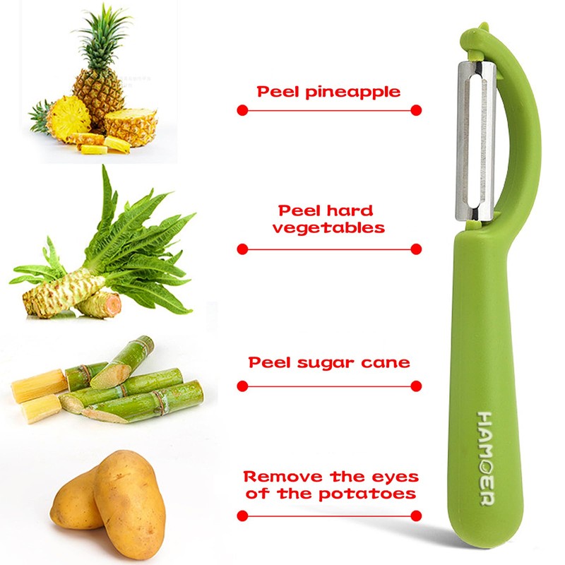 - This peeler is a double-edged straight blade made of tough, rust-resistant 420 stainless steel. It's perfect for peeling all fruits and vegetables, including tough sugar cane skins.