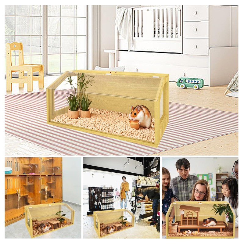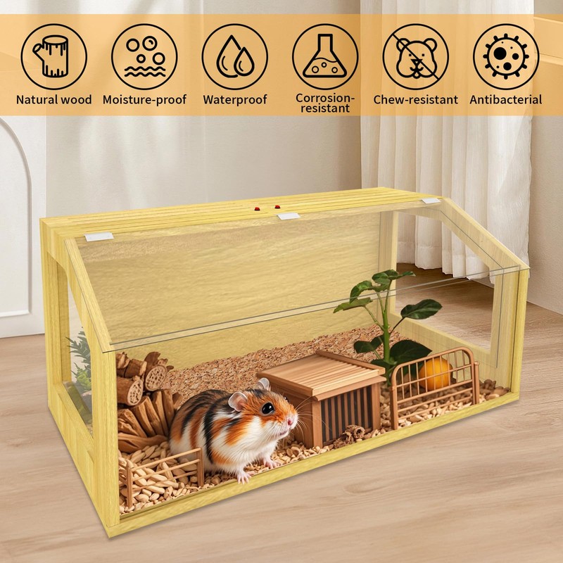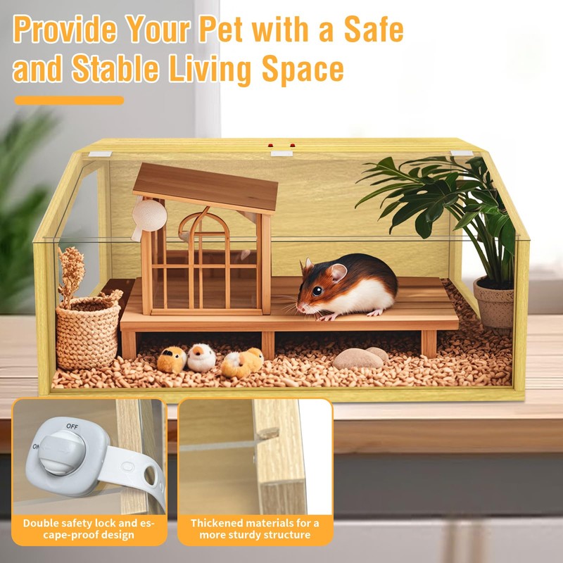 - Cozy Hamster Habitat: FHNI hamster cage is crafted from thick natural wood and thick clear acrylic materials, featuring eccentric bolt assembly for enhanced stability and durability