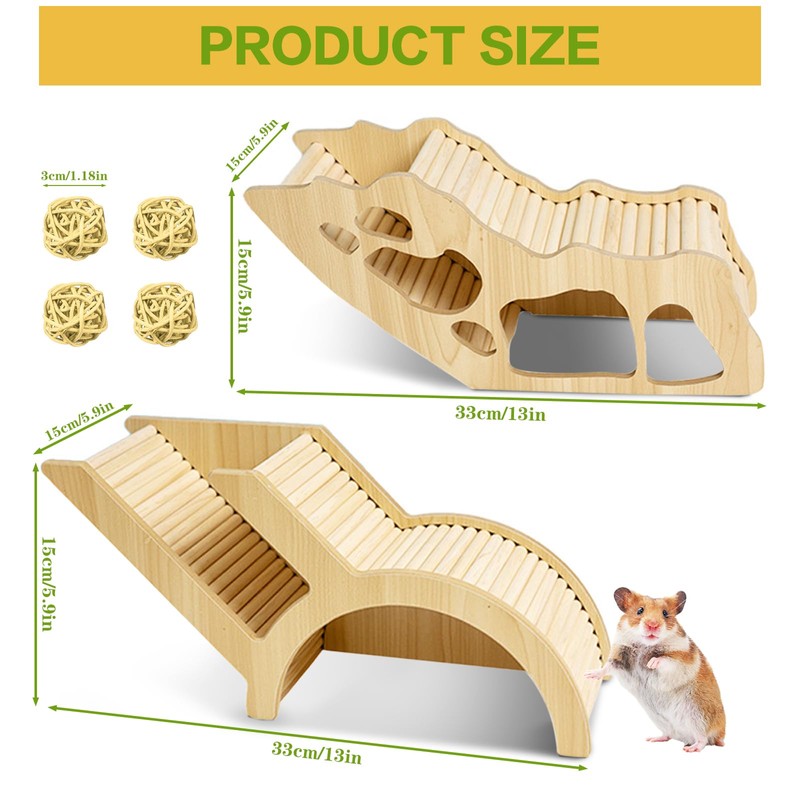 - Hand-made and Pet-friendly material: Hand-made by selected birch plywood & beech sticks without nails, the whole structure is sturdy and there have no gaps on climb ladders of the roof. Each corner of this hamster house are sanded smooth, brings you a durable & chewable hamster house & toy, helps to relieve their chewing desire & protect the pet’s teeth.