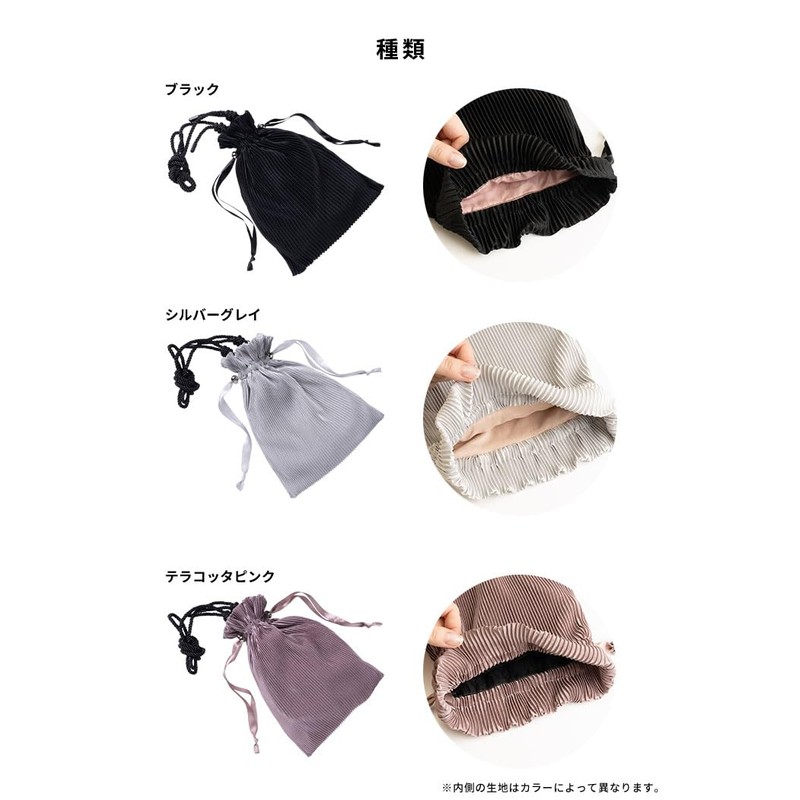 - Drawstring pouch for easy outings. Drawstring pouch for storing small items such as smartphones and cosmetics. Black shoulder strap included. The length can be adjusted easily by making a knot