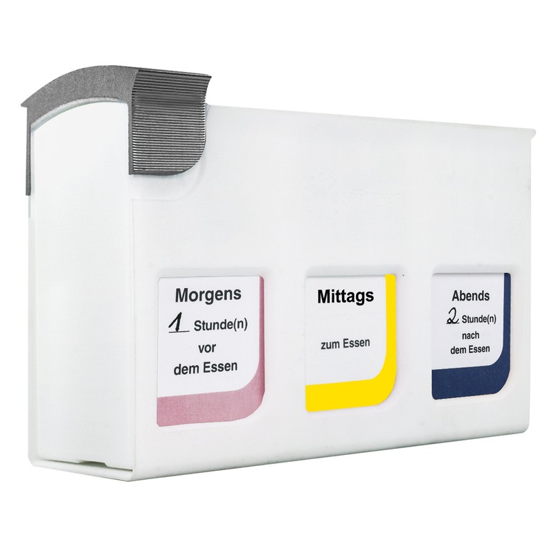 - How does it work? Simply use your medication plan to find the appropriate stickers from the enclosed 9 intake time labels and stick them on the boxes. Now fill all medications (blisters, spray, drops, etc.) into the appropriate time boxes. Medicines with the same intake time all belong in the same time box. Close the lock. Now push the filled boxes in one by one after the time of day from right to left.