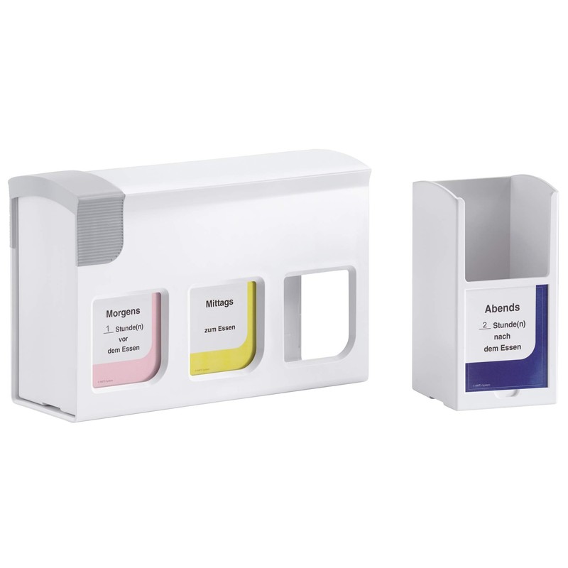 - The mediTimer medication dispenser impresses with its simple and intelligent system, which supports medication intake and guides safely through the day. Not only tablets in original packaging, but also bottles, tubes and sprays can be sorted into the three large time boxes of the dispenser - once sorted, rest for weeks
