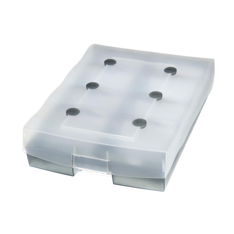 - The business card box is stackable and equipped with an individualisable lid. When opened, the lid disappears under the organiser box