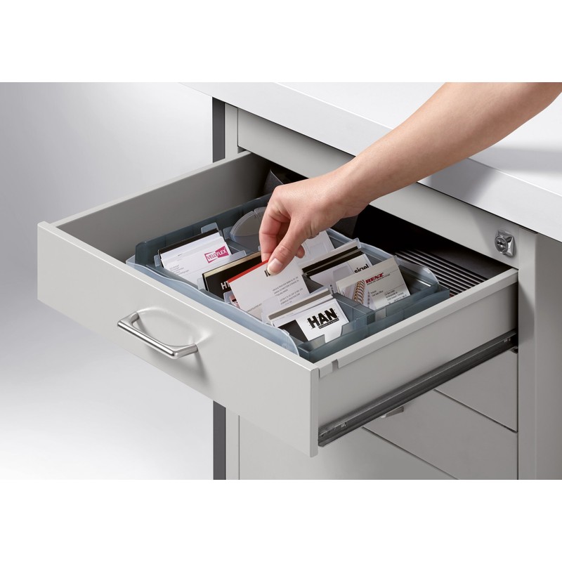 - For storing business cards in large quantities: up to 2,200 DIN A8 business cards fit into the organiser box with lid - practical desk accessory for the office