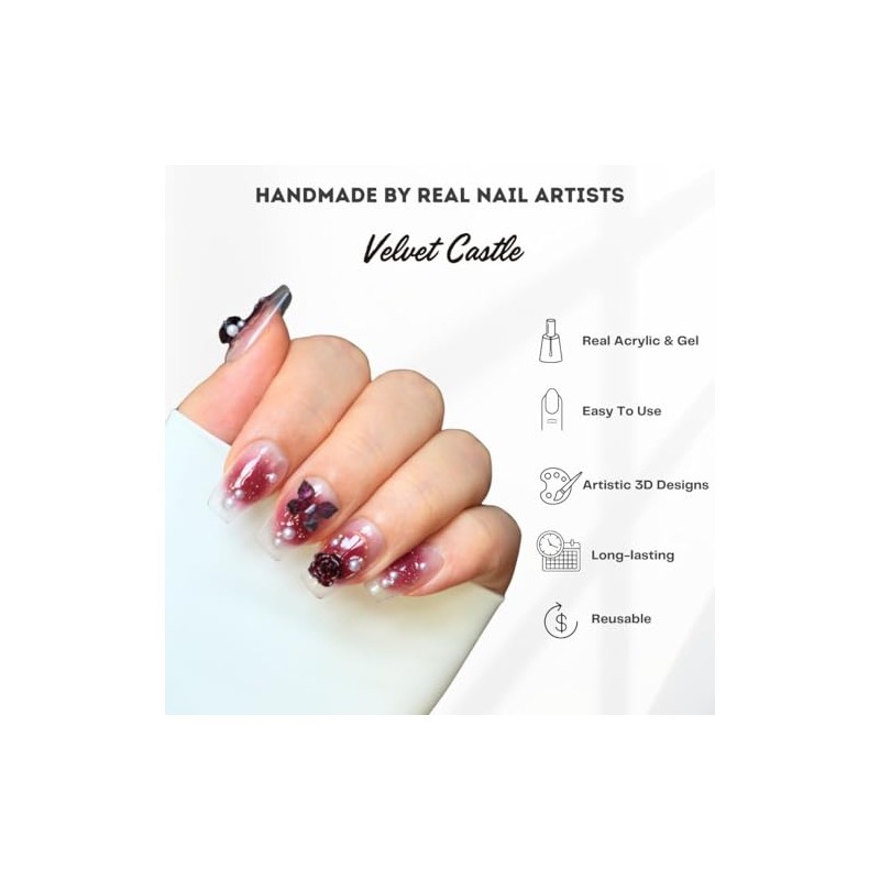 Hanakoko Handmade Press-On Nails, Floral Designs with Glitter and Pearls, Coffin Shape Press-on Nails Reusable 10 Pcs (Velvet Castle, S)