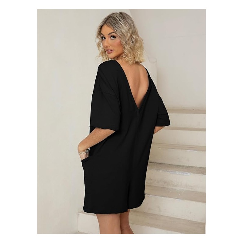 Hanaoops Women's Jumpsuit Summer Short Playsuit Casual Half Sleeve Crew Neck T-Shirts Jumpsuit One-Piece Romper Loose V-shaped Backless Playsuit One-Piece, black