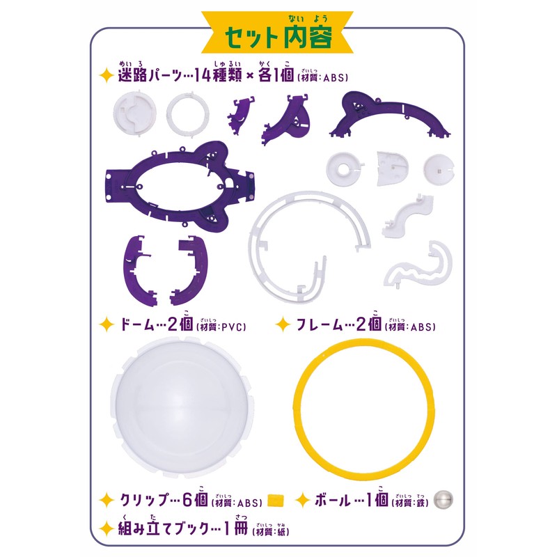- (Set Contents) Maze parts: 14 types x 1 each, dome: 2 pieces, frame: 2 pieces, clips: 6 pieces, ball: 1 (English language not guaranteed)