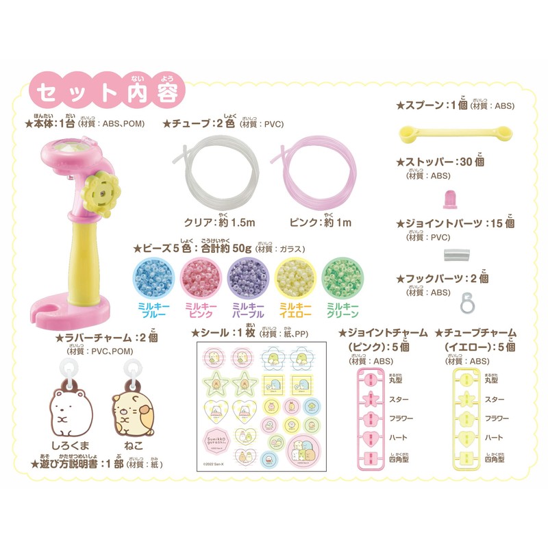 - Set Includes: Tubelet x 1, Spoon x 1, Tube (Clear, Pink) x 1, Beads 5 Colors (Milky Blue, Milky Pink, Milky Purple, Milky Yellow, Milky Green) x Total Approx. 1.8 oz (50 g) / Joint Parts x 15, Stoppers x 30, Rubber Charms x 2, Hook Parts x 2, Joint Charm x 5, Tube Charm x 1, Sticker x 1 (English language not guaranteed)
