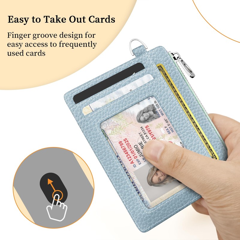 - Large Capacity: Slim credit card holder is made of PU leather with exquisite pattern printing, it offers a comfortable hand feel, silver metal zipper and good stitching to ensure women's wallet longevity. It contains 6 card slots, a finger glide transparent window and a zipped coin pocket (can also hold cash). The wider slots ensure easy access to your credit cards, business cards, ID cards, driving licences and more, with plenty of room for your everyday needs