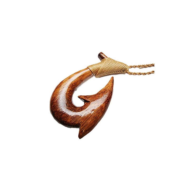 Hand Carved Natural Hawaii Koa Wood Fish Hook Fishhook/Hei Matau Pendant Artistically Knotted w/Adjustable Brown Hemp Cord Necklace/Choker - Hawaiian/Polynesian Maori/New Zealand Style