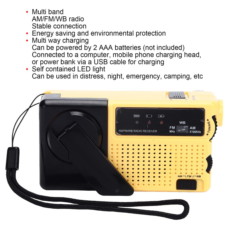 1、MULTI BAND RADIO: This multi band hand crank AM/FM/WB radio has built in high quality speakers and comes with a USB cable for stable connection. 2、CONVENIENT: Energy saving and environmental protection, easy to use, hand cranked handle for charging, to meet your lighting needs in different scenarios. 3、MULTI WAY CHARGING: Can be powered by 2 AAA batteries (not included), or connected to a computer, mobile phone charging head, or power bank via a USB cable for charging. 4、SELF CONTAINED LED LIGHT: Flashlight light, super bright light source, energy saving and power saving, can be used in distress, night, emergency, camping, etc. 5、OUTDOOR EMERGENCY: When your mobile phone is out of power, you can charge your mobile phone through the DC 5V output for emergency calls or outdoor emergency.