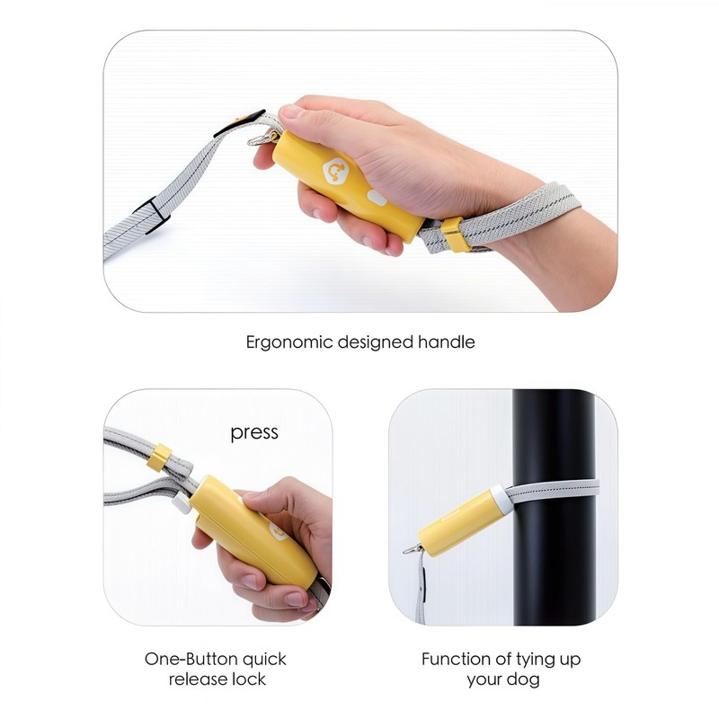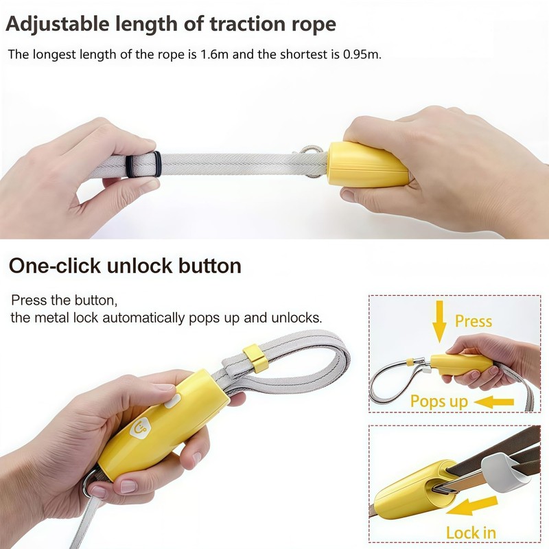 - Release your hands: With a one click release pin, you can secure the dog leash to your wrist, tree trunk, utility pole, or chair legs in the park when you need. The size of the wrist belt can be adjusted as needed.