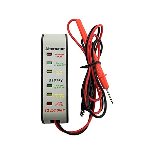 - Battery Testing: A. With engine off, touch the positive battery post with the red probe & the negative post with the black clamp. B. The LED indicator will show battery condition. Alternator Testing: A. With engine running, touch the positive battery post with the red probe & the negative post with the black clamp. B. The LED indicator will display the alternator output.