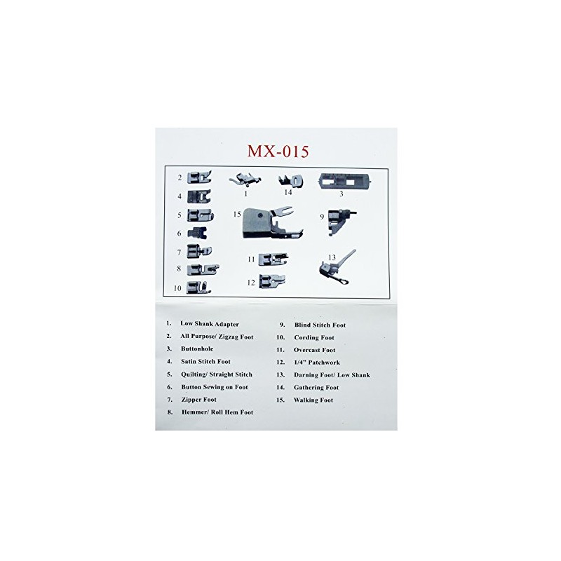 - Set includes 1. Low shank adapter 2. All Purpose / Zigzag foot 3. Buttonhole 4. Satin stitch foot 5. Quilting / straight stitch 6. Button sewing on foot 7. Zipper foot 8. Hemmer / roll hem foot 9. Blind stitch foot 10. Cording foot 11. Overcast foot 12. 1/4" patchwork 13. Darning foot / Low shank 14. Gathering foot 15. walking foot