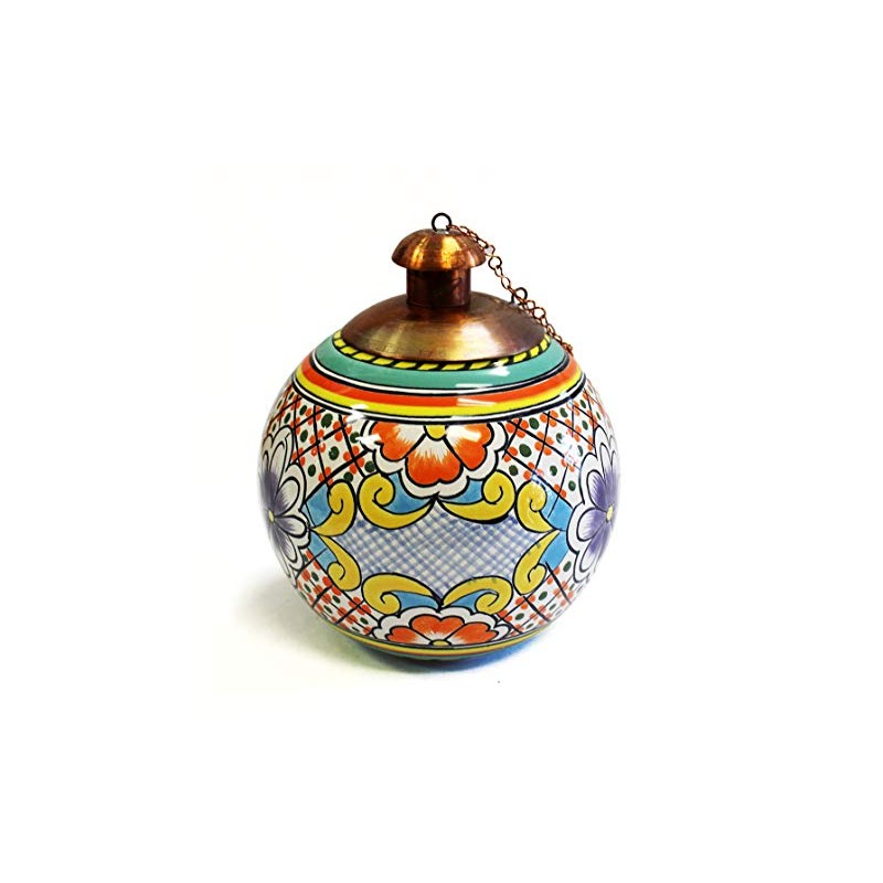 This beautiful and elegant Classic Sphere Table Top Torch designed exclusively for Tierra Fina will give years of enjoyment while adding an artisan flair to any outdoor table or garden patio. These artisan designed torches are individually handcrafted and hand painted in central Mexico. Because they are a high-fired ceramic, their beautiful finish will not peel or fade from sun or salt air. Torches come complete with snuffer and long-life fiberglass wick that allow the oil to be burned, not the wick. The easy to remove fuel vessel allows for easy refill and with it's 10 oz. (275 ml.) capacity a long burn. Can be used with citronella, bug fighter or other lamp oil.