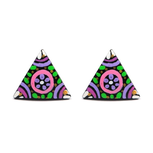 Hand painted vibrant purple flower in circle coconut shell triangle stud earrings with plastic posts