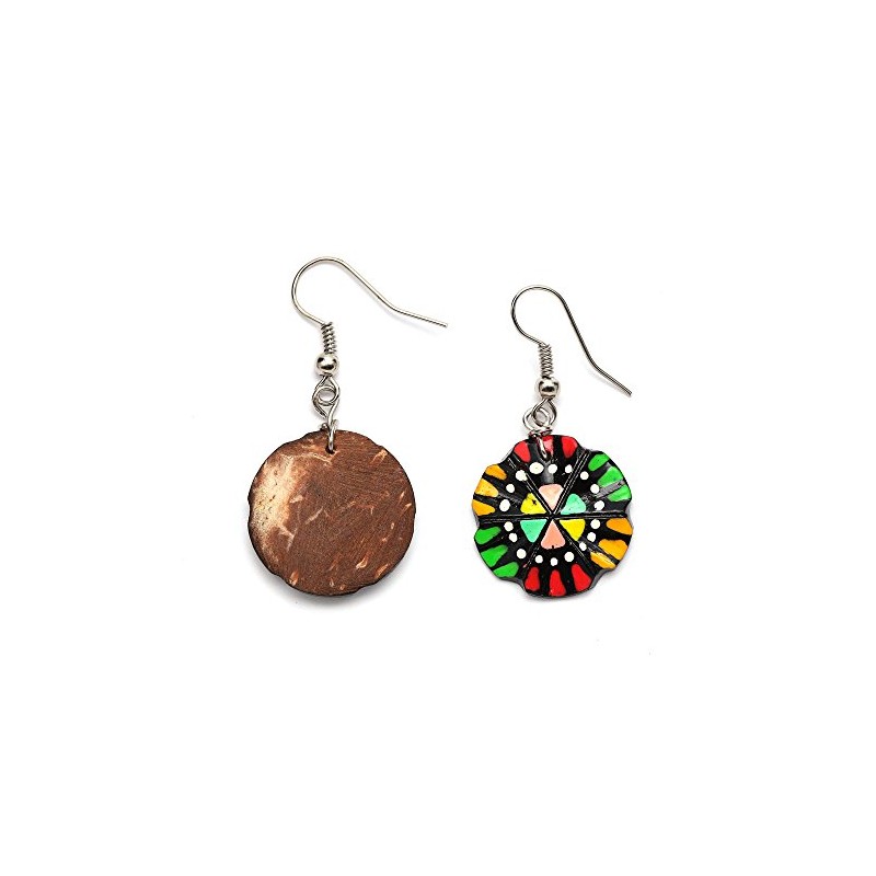 Hand painted vibrant red and green tropical flower coconut shell drop earrings