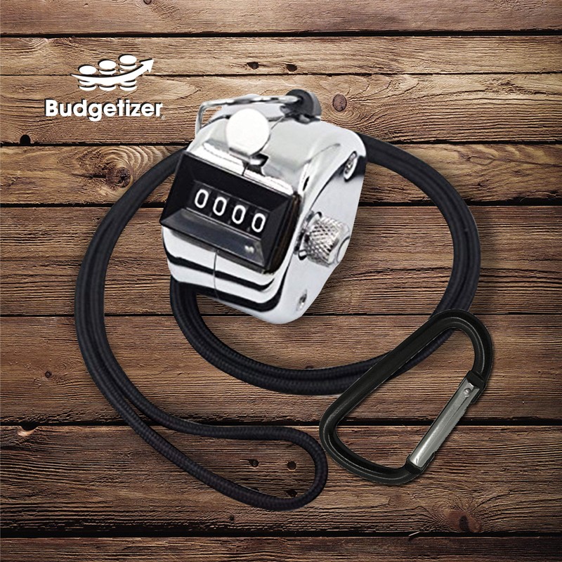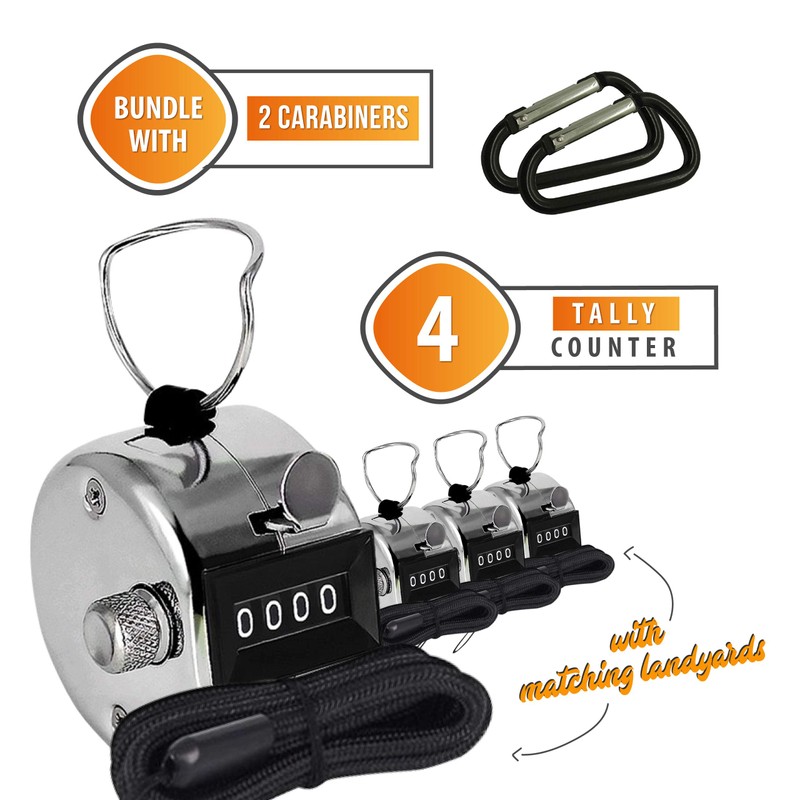 - GREAT VALUE TALLY COUNTERS SET WITH LANYARD AND CARABINER – Budgetizer Hand Tally Counter Clicker Set offers the complete package including 4 stainless steel tally counters in Silver (1.75 inches Wide, 1.25 inches Tall) each with a nylon lanyard and 2 carabiners in Black; Use the included carabiner to attach the tally clicker counter to your backpack, athletic gear or travel bag to keep it handy at all times while the whistle lanyard can be worn as a key chain necklace around your neck or wrist