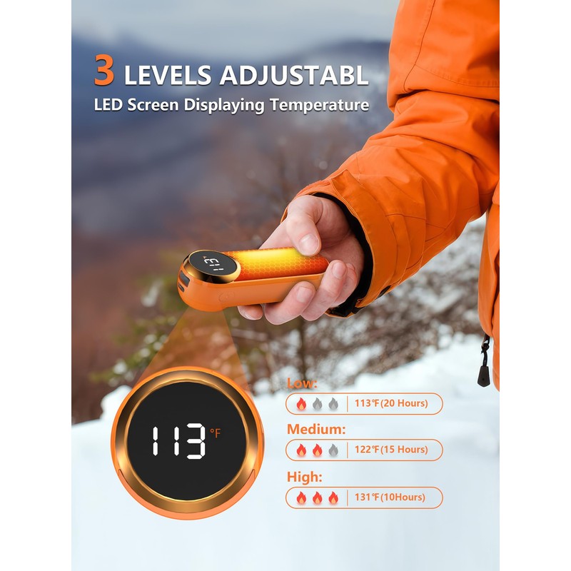 - LED Display: Electric hand warmers built-in with LED display to displays remaining power that relieve the anxiety caused by low battery. It also displays the 3 heating levels. with heat up to 131℉