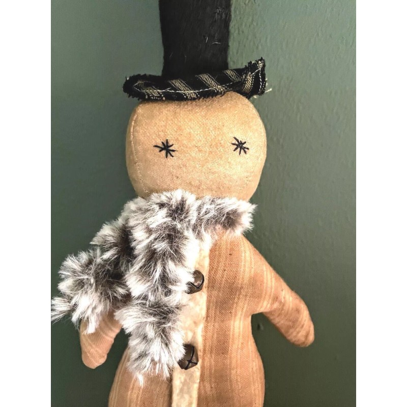 This is a unique prim looking Snowman with stove pipe Hat. He is handcrafted and 13" tall. He is very festive in his red striped jumper , fuzzy scarf and rusty bells. Looks great in a bowl of greens, tucked in tree or wreath or displayed on shelf.