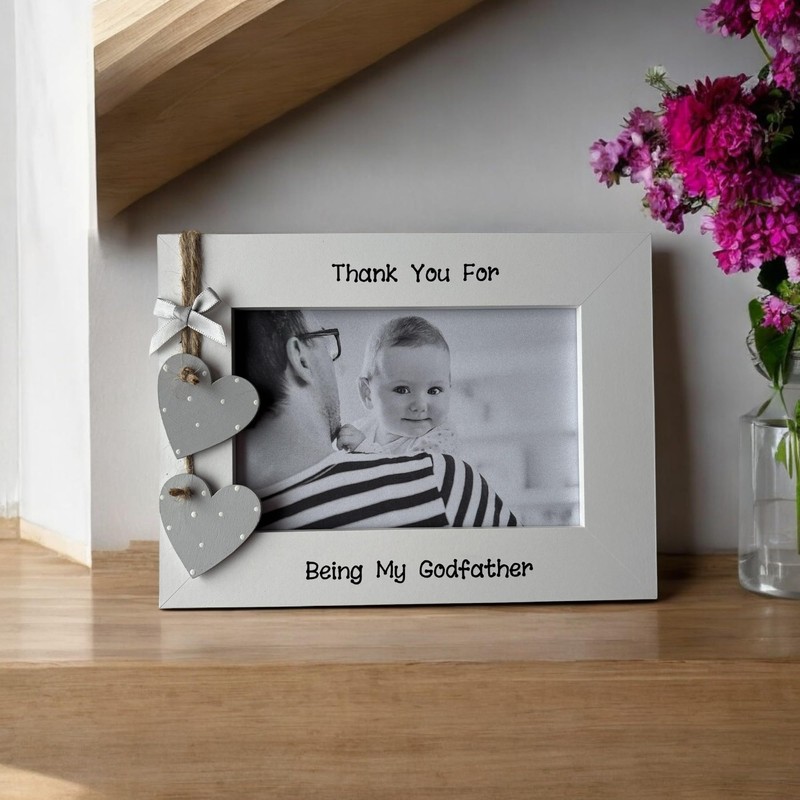 Handcrafted Thank You For Being My Godfather Gift Photo Frame 6x4 Landscape White Grey Wooden Hearts