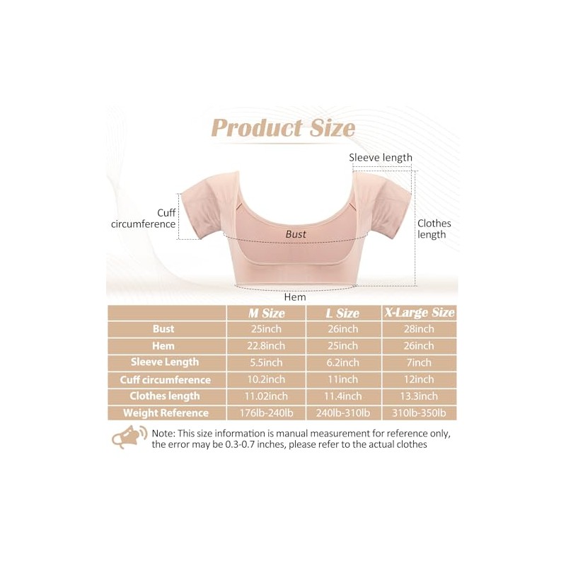 Features:Nice presents:can give the underarm vests as a birthday gift to your friends, family, colleagues or neighbors, the comfortable fabric can bring them a relaxed mood and make your relationship more intimate.Accent your outfit:The classic colors of armpit vests can be matched with most of your clothes, such as short skirts, leggings, and jackets, adding charm to your daily attire and making you stand out from the crowd.Specifications:Material: nylon and spandexColor: white, black, nudeSize:Bust: 28 inchHem: 13 inch (elastic stretch)Sleeve Length: 7 inchCuff circumference: 12 inchClothes length: 13.3 inchWeight Reference: 310lb-350lbPackage includes:6 x Sweatproof undershirt for womenNotes:Manual measurement, please allow slight errors on size.The color may exist a slight difference due to different screen displays.