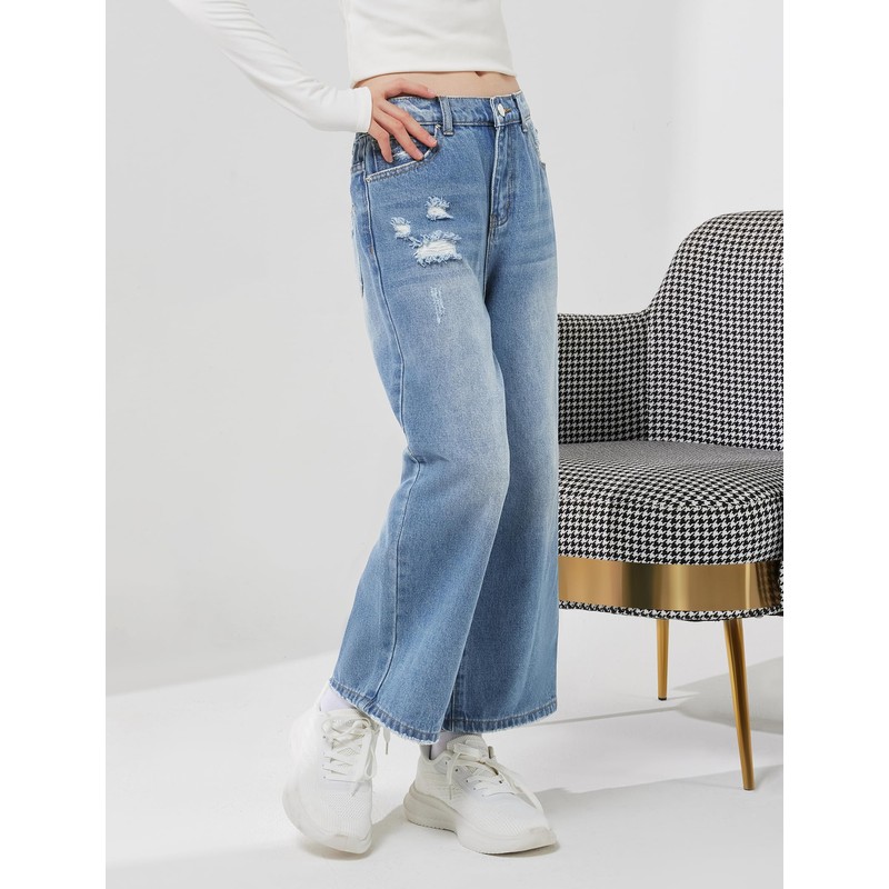 - Feature: Girl jeans pants with trendy ripped detail gives instant street cred kids adore. The adjustable elastic waistband ensures a comfy, secure fit as they grow. Straight-leg cut moves with their everyday adventures. Classic pockets complete the timeless design