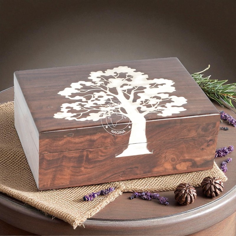 Diese handgefertigte antike Holzkiste verfügt über komplizierte Gravuren von von der Natur inspirierten Symbolen wie Lebensbaum, Mandala, Vögel, keltisches Kreuz usw. Kombiniert ästhetischen Charme mit praktischem Gebrauch, dient es perfekt als Schmuckschatulle, Andenken-Urne oder Aufbewahrungsbox.