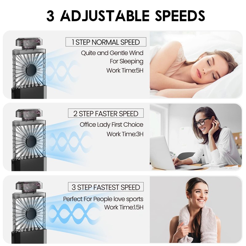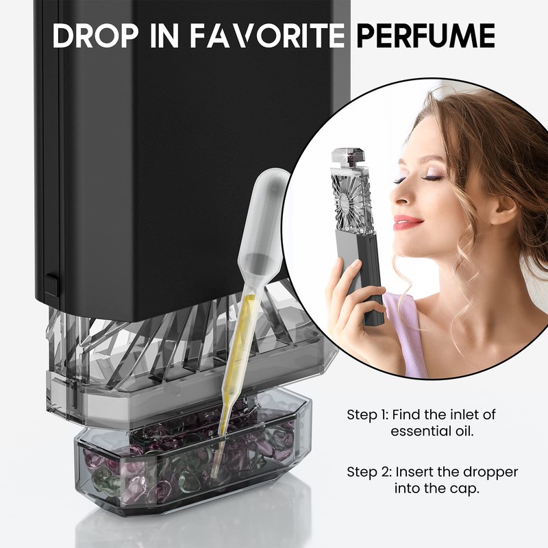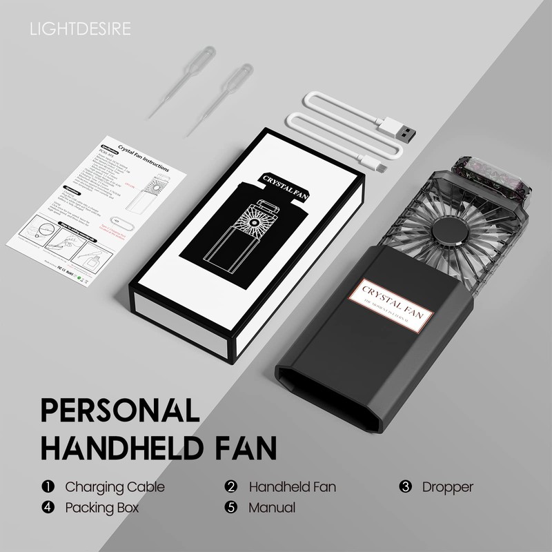 **LIGHTDESIRE hand held fan design with a perfume bottle appearance,fashion unique design, perfect for girls/women, weather gadgets for kids, it could be hold in your hand easily and take it go, lightweight but gives you a strong wind.** Every silent hand fan is equipped with an extra piece of odorless sheet,on which you can spray your favorite perfume so as to gain perfume airflow. The odorless sheet can be used repeatedly. To relax and relieve stress. Powerful airflow, the strong wind fan offers 3 speed settings, each will birngs you strong airflow. Built-in battery, works a long time by each full charging. Please keep the battery power is enough. Adopted high quality environmental ABS material, it is toxic free and comfortable grip. Super mini personal size battery operated fan, easy to take it anywhere. It's a perfect partner in such hot summer to keep you cool when traveling, hiking, camping, waiting in line. **Note:** Do not pull out with strong force that would break it. **Specifications** Could be recharged by 5V output adapter, USB charger, laptop, computer, power bank and other USB-enabled devices. Size: 74×26×130mm / 2.9×1×5.1inch Speed Level: 3 ranges Battery Term: 2~5 Hours(depended on different speeds) Battery capacity: 1200mAh Charging Time: about 3.5 hours Charging indicator: Blue light flickers Full Charged: Blue light constant on **One year repair** Once you have any issue on your personal fan such as breakdown, breakage, or other troubles occurred in within normal use, please contact us, we will give you a satisfied solution. **Package Contents:** 1 x personal space saving fan 1 x USB Data Cable