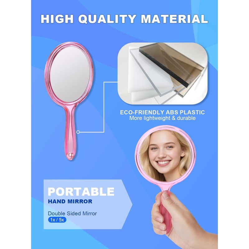 Handheld Makeup Mirror with Handle – Double-Sided 1X/5X Magnification, Travel-Friendly, 10.5 x 5.7 inch, Pink Mirror for Women